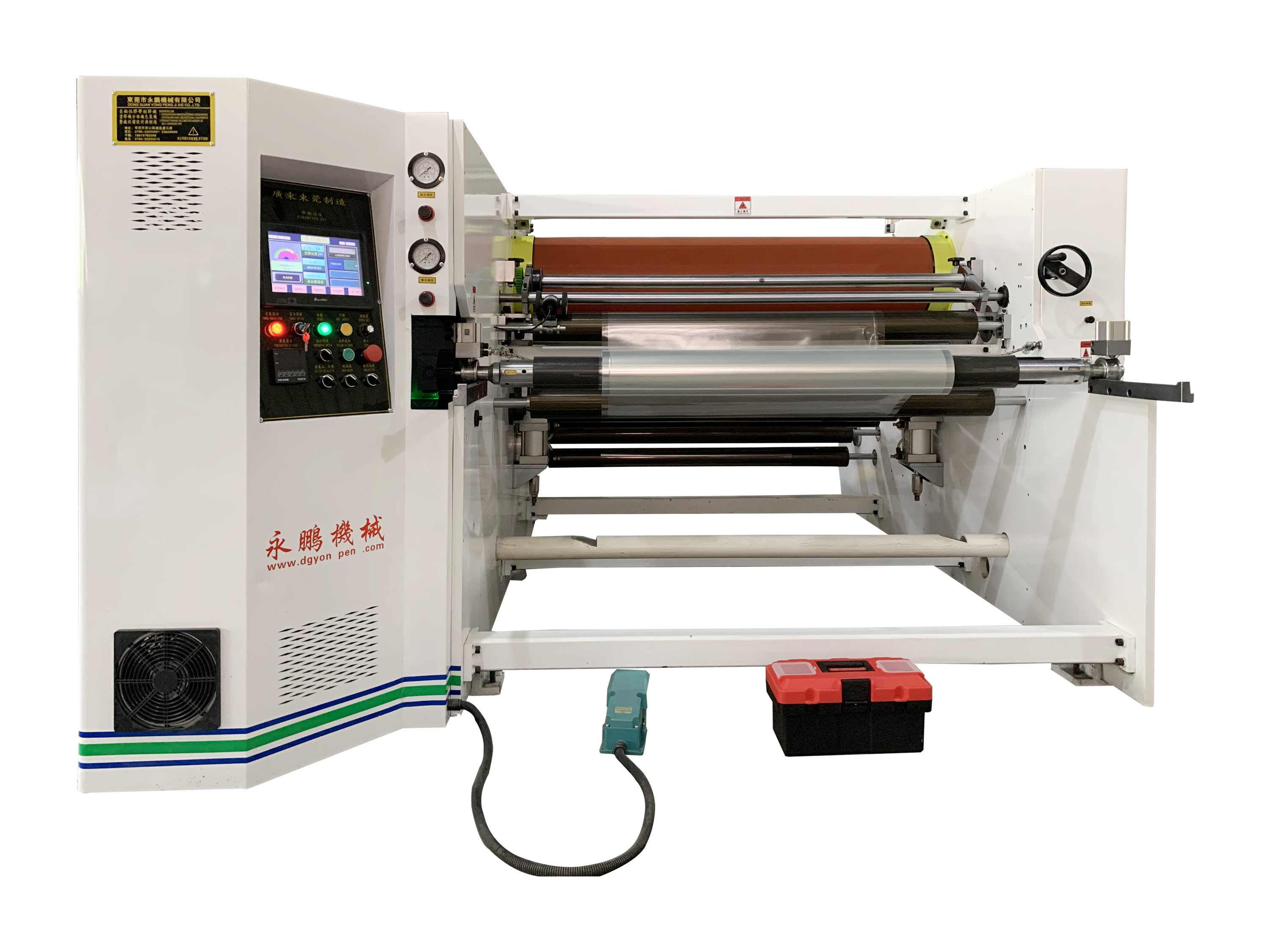 热贴合复卷机的用途及应用 接下来有东莞市永鹏机械有限公司为大家介绍热贴合复卷机的用途及应用: 热贴合复卷机主要用于导电胶,热融胶,百美贴胶带,TPU,PET保护膜等的分条机,同时具有加热功能。 收卷部分采用超声波自动纠偏,精度高。 磁粉张力控制确保成品质量。 带蜗杆调剂系统的上、下圆刀分条,最小分切宽度可达25MM 机速0-80米\每分钟,变频调速。 自动记长,机器到达设定长度自动停机。 离心风机自动吹边排废。 模机温自动控制加热辊温度,温度范围0-180摄氏度。